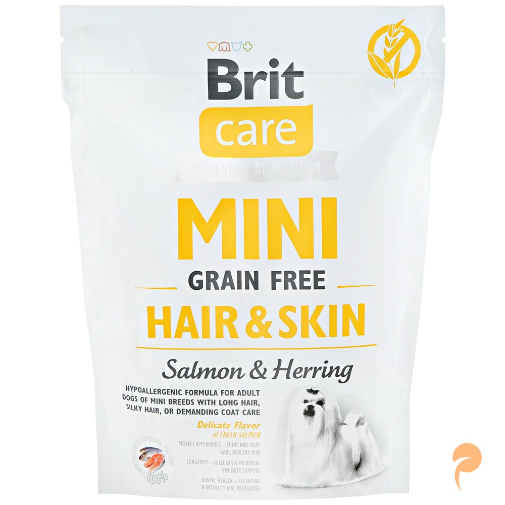 Brit Care Mini Grain Free Hair & Skin - повнораціонний, беззерновий, сухий корм супер преміум класу з відмінною засвоюваністю. Містить оптимальний баланс поживних речовин, незамінні жирні кислоти Омега-3 і Омега-6 і вітаміни групи В, які сприяють підтримці здоров'я шкіри і роблять шерсть блискучою і красивою.