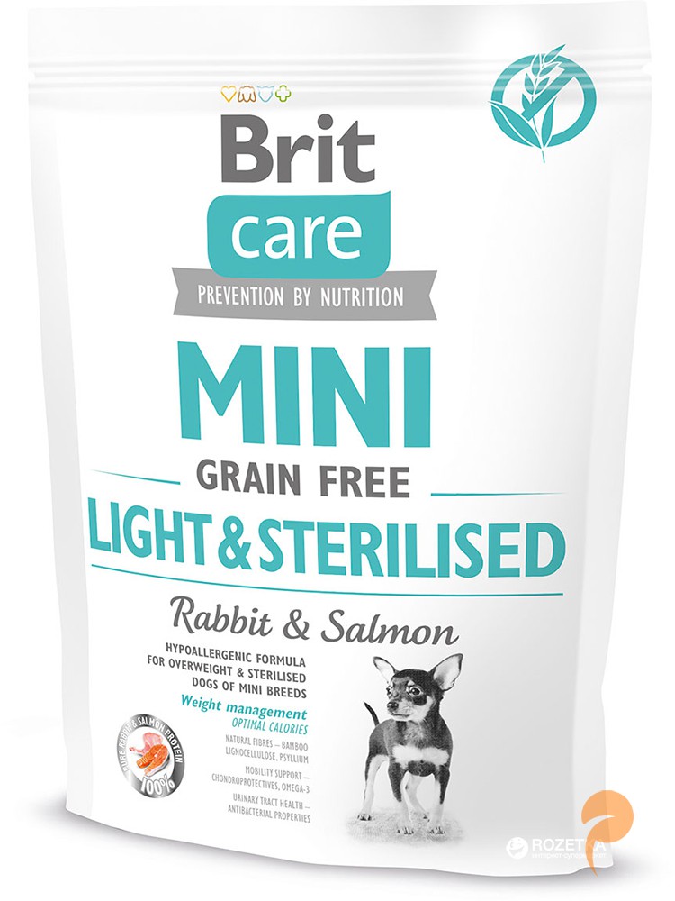 Brit Care Mini Light&Sterilised — це сухий беззерновий гіпоалергенний корм для собак мініатюрних порід із надмірною вагою або стерилізованих собак.