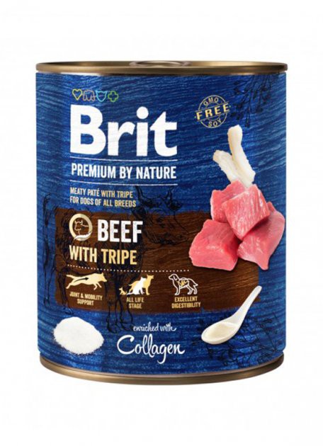 У баночці корму Brit Premium By Nature Beef with Tripe знаходиться м'ясний паштет із додаванням рубця. Останній компонент робить консерви найсмачнішою їжею.