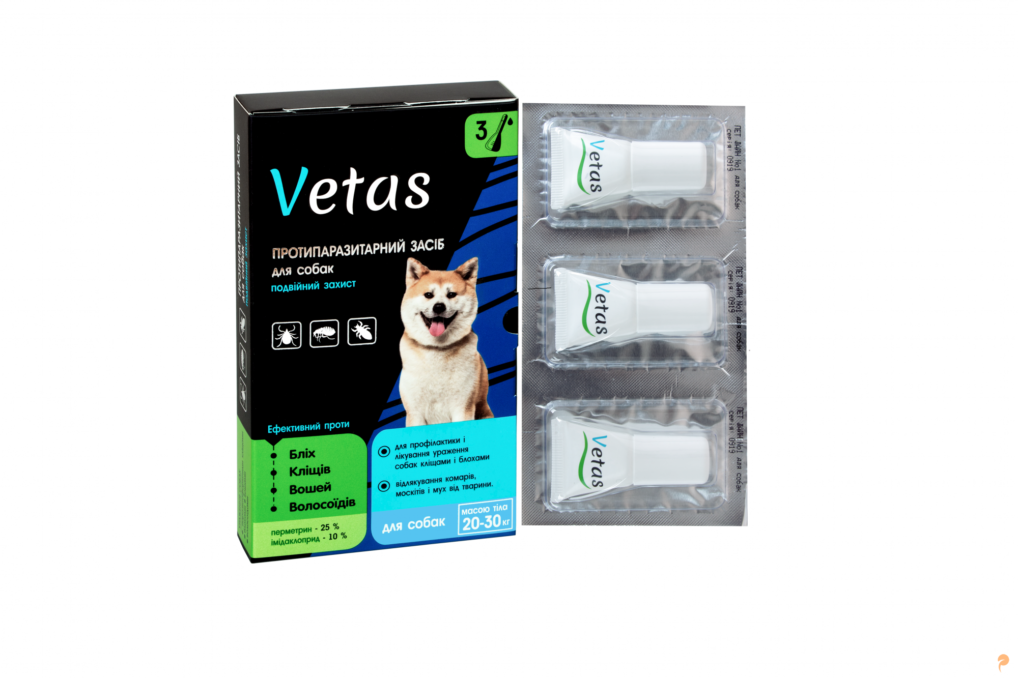 Застосування: Для тварин вагою 20-30 кг застосовують 1 піпетку крапель VETAS (4 мл). Препарат застосовують зовнішньо одноразово на суху неушкоджену шкіру. Розгорнувши шерсть, препарат наносять в 3-4 точки вздовж хребта, від холки до хвоста. Після обробки тварин ектопаразити гинуть через 12 годин, іксодові через 48 годин. Захисна дія препарату проти бліх, волосоїдів, вошей і інших, після одноразової обробки тварини триває до 4 тижнів. Повторні обробки, при необхідності, проводити 1 раз на місяць.